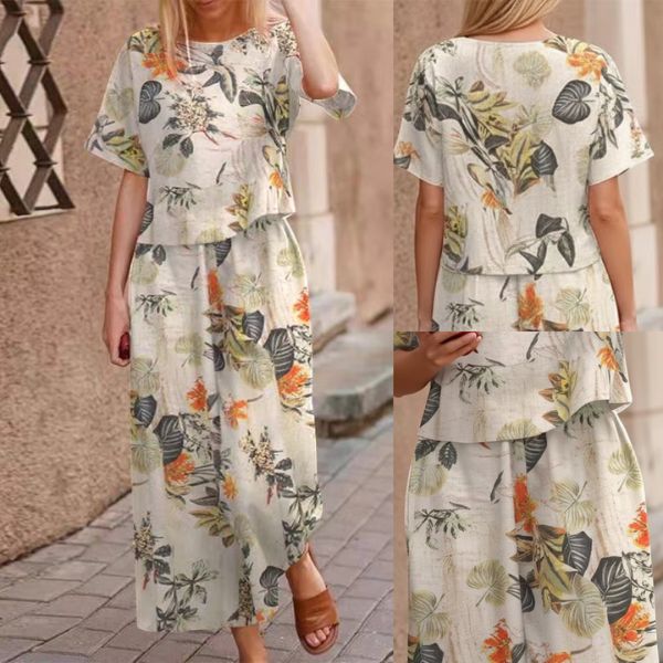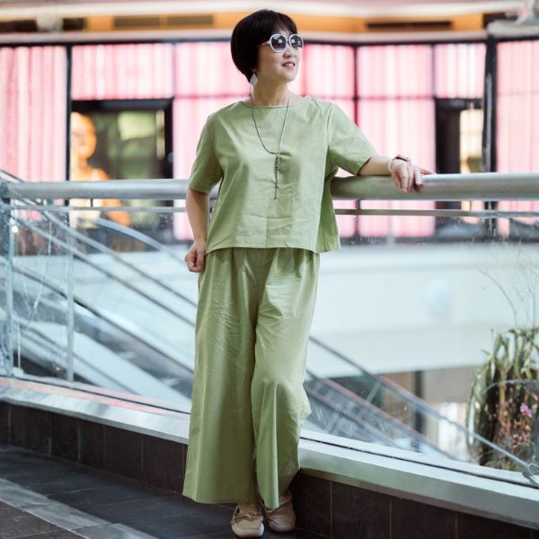 The top has these relaxed shoulders and wide short sleeves that drape beautifully without clinging. The wide-leg trousers flow when you walk, creating this effortlessly elegant silhouette that somehow makes you look taller and more pulled-together.